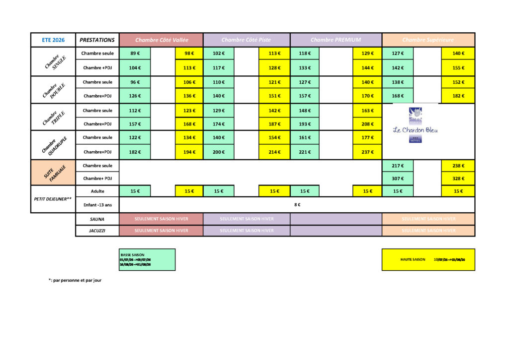 Tarifs hôtel*** Le Chardon Bleu été 2026